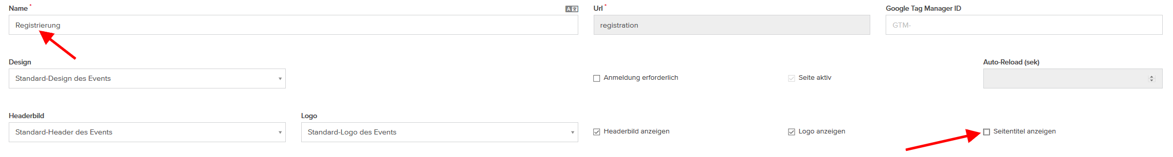 2. Der Name wird im automatisch generierten Seitentitel übernommen, der auf der Event-Website angezeigt wird. Sie können den Seitentitel ausblenden, in dem Sie die Checkbox “Seitentitel anzeigen” deaktivieren.