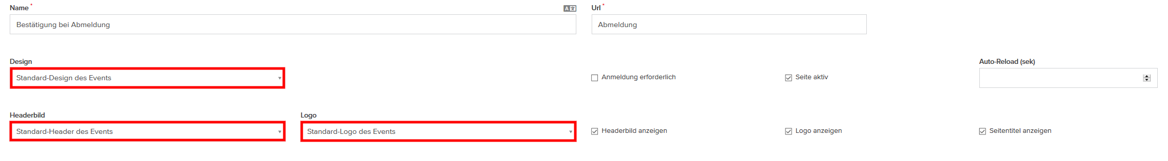 Um Headerbild oder Logo für eine Seite auszublenden, deaktivieren Sie die Checkboxen “Headerbild anzeigen” bzw. “Logo anzeigen”.