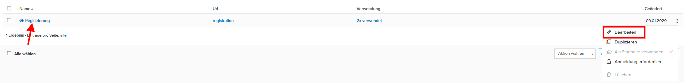 2. Um eine bestehende Seite zu bearbeiten, können Sie entweder den Seitennamen anklicken oder im Schnellmenü auf "Bearbeiten" klicken.