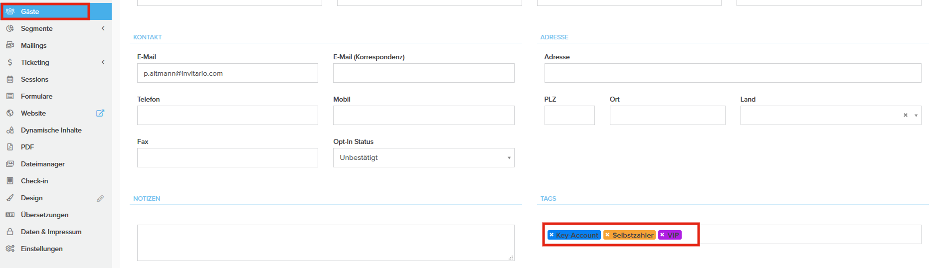- Zuweisen von Tags beim Bearbeiten der Gästedaten: Öffnen Sie in > Gäste einen Gast durch das Klicken auf den Namen und fügen Sie im Feld "Tags" einen oder mehrere Tags ein.