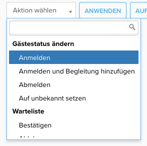 Verwenden Sie diese Variante, wenn Sie den Status eines oder mehrerer Gäste aktualisieren möchten und die Gäste keine Bestätigungsmail erhalten sollen. Wollen Sie den Gästen nach erfolgter Statusänderung z.B. auch eine Anmeldebestätigung übermitteln, können Sie dies ebenfalls über "Aktion wählen" durchführen.![]()