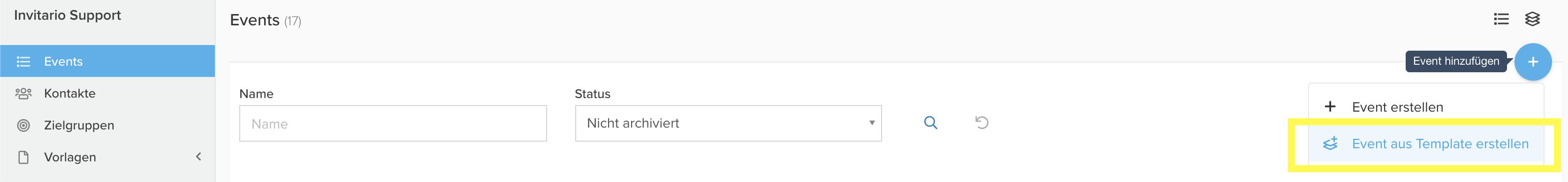rechts oben über dem Hinzufügen-Symbol . Wählen Sie nun "Event aus Template erstellen" (wird nur angezeigt, wenn zumindest ein Event-Template im Account vorhanden ist).