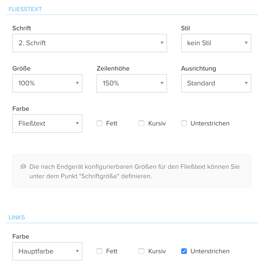 - Größe: Schriftgröße im Verhältnis (%) der im Reiter "Einstellungen" im Absatz "Schriftgröße" definierten Schriftgrößen des Fließtextes (in px).