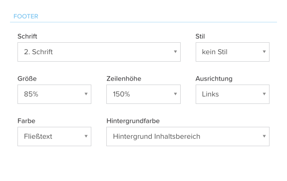 - Ausrichtung: Die Standard-Ausrichtung wurde im Reiter "Einstellungen" im untersten Absatz definiert und kann hier je Schriftsatz geändert werden (z.B. Standard-Ausrichtung des Fließtextes ist links, der Footer soll aber mittig dargestellt werden.