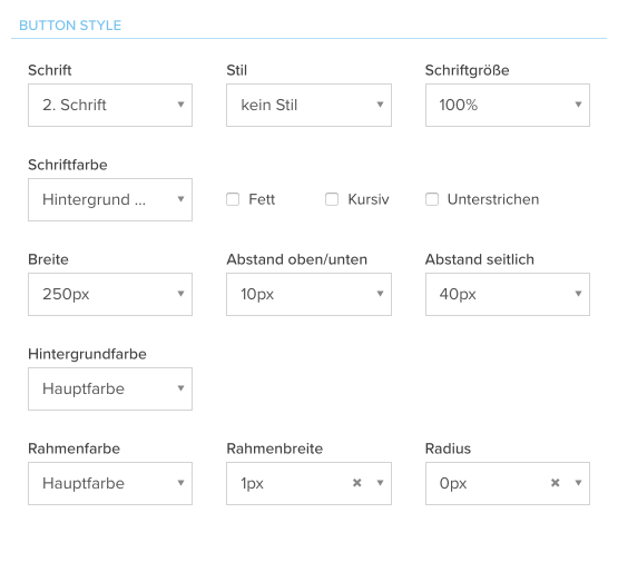 - Radius: Definieren Sie ob die Ecken der Buttons abgerundet dargestellt werden sollen und den Radius der Abrundung.