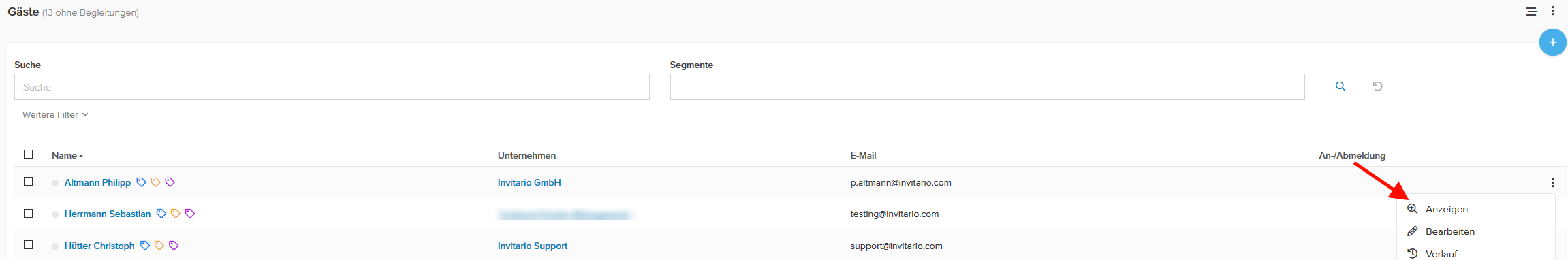 In der Gästeliste können Sie nach Gästen suchen, diese anzeigen und bearbeiten.