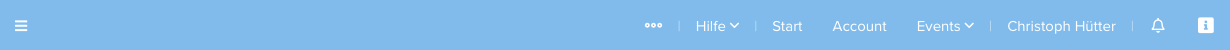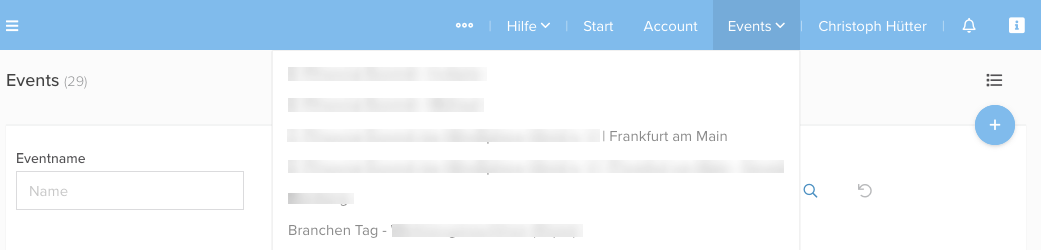 Sie erreichen die Eventebene in dem Sie in der Eventliste im Menüpunkt > Events auf den Eventnamen klicken oder in der Headerzeile unter "Events" die gewünschte Veranstaltung wählen.