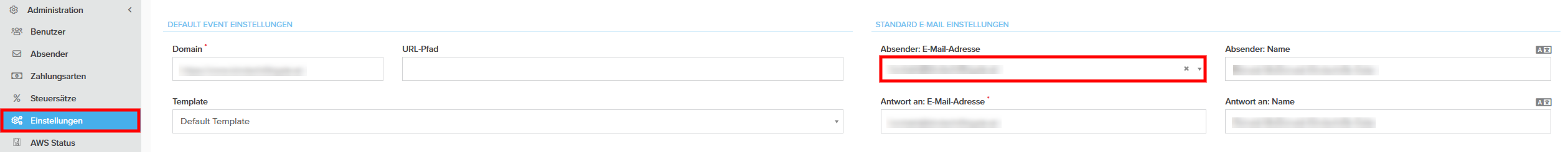 Um die Absender-E-Mail-Adresse als Standard-Absende-Adresse Ihres Accounts festzulegen öffnen Sie > "Account" > "Administration" > "Einstellungen" und wählen im Feld "Absender: E-Mail-Adresse" die gewünschte Adresse aus.