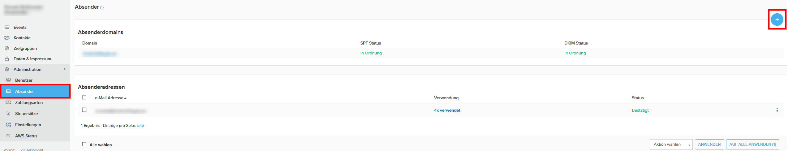 Öffnen Sie im Seitenmenü > "Administration" > "Absender" und klicken Sie auf den Button