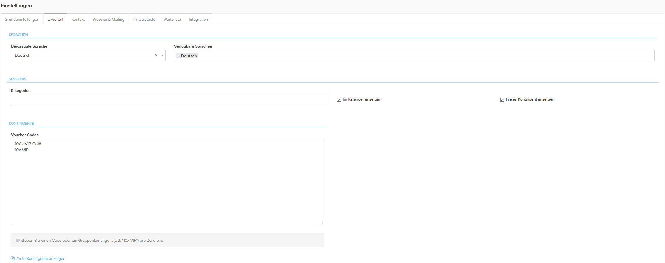 - Sessions Kategorien: Können im Account-übergreifenden Event-Kalender verwendet werden, um dort nur bestimmte Events einer Kategorie anzuzeigen.