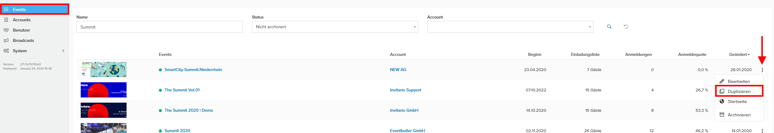 Um eine Veranstaltung zu duplizieren wechseln Sie in den Account und klicken auf Events. Das Duplizieren-Symbol finden Sie direkt bei jeder Veranstaltung im Aktionsmenü – dieses befindet sich in der Zeile der Veranstaltung ganz rechts außen und wird durch 3 Punkte symbolisiert. Der Status des zu duplizierenden Events spielt dabei keine Rolle.