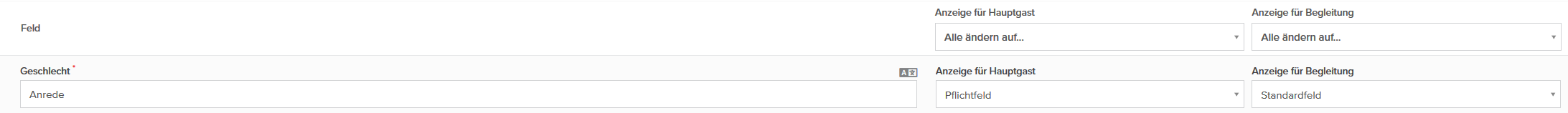 In dieser Ansicht konfigurieren Sie die Felder und Inhalte des Anmeldeformulars. In der angezeigten Tabelle wird zwischen den Spalten “Feld”, “Anzeige für den Hauptgast” und “Anzeige für Begleitungen” unterschieden.