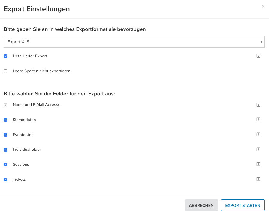 - Detaillierter Export: zusätzlich zu den Statusänderungen der gewählten Felder werden auch die Daten und Uhrzeiten der jeweiligen Felder mit exportiert. (z.B.: zum Anmeldestatus wird zusätzlich die "Zeit der An-/Abmeldung" und die "Letzte Änderung" hinzugefügt)