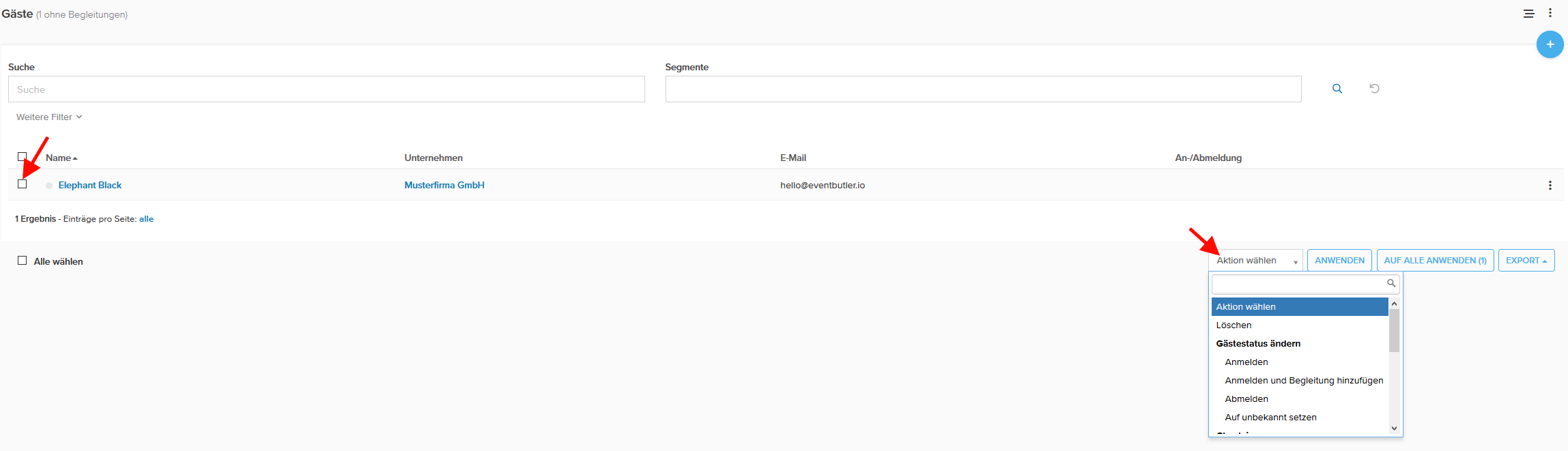 Markieren Sie hierzu den gewünschten Gast oder die gewünschten Gäste und öffnen Sie das Auswahlfeld "Aktion wählen" am Fuße der Liste. Durch Klick auf den Button "Auf markierte anwenden" wird die Aktion bei markierten Gästen durchgeführt, klicken Sie auf den Button "Auf alle anwenden", um die Aktion bei allen Gästen der Gästeliste durchzuführen.