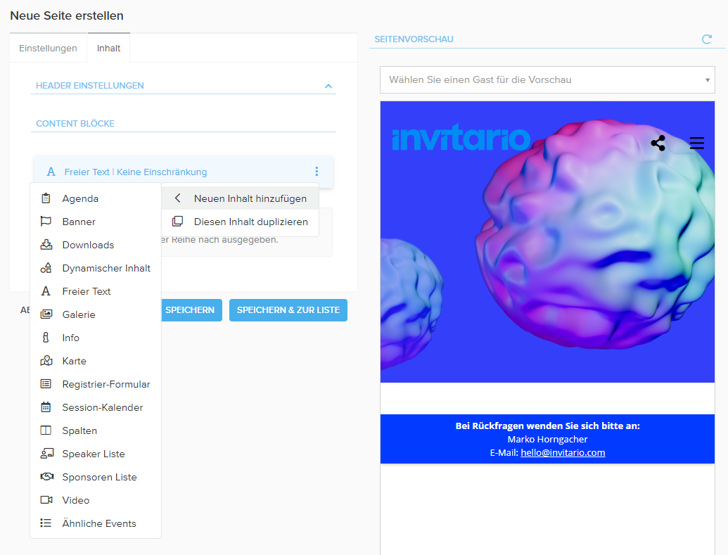 Mit Makros können Sie unter Event-Basisddaten, Gästedaten, personalisierte Ansprachen, Verlinkungen zu Seiten, Formulare, Bilder und Dateien und personalisierten PDFs in "Dynamischen Inhalte" einfügen. Die Makros-Befehle werden in der unteren Zeile ...