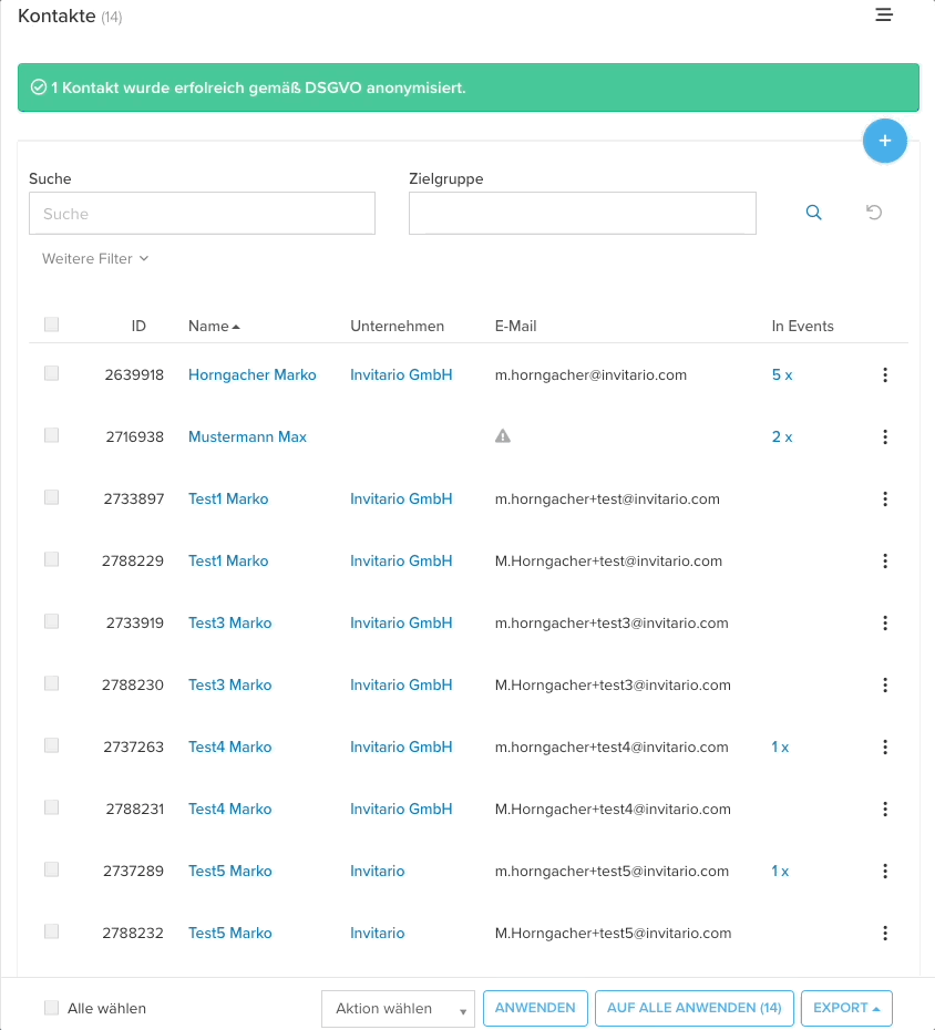 Nach Auswahl der Kontakte > Aktion wählen > "Anonymisieren"