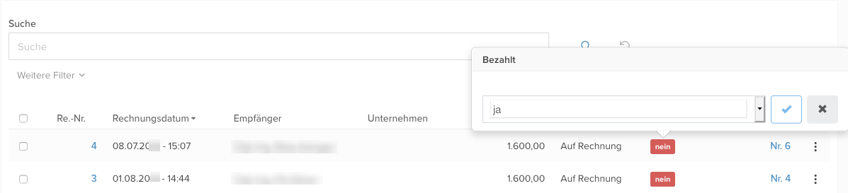 - Um diese Zahlungseingänge bei Rechnungen mit der Zahlungsart “Zahlung auf Rechnung” zu dokumentieren, klicken Sie auf “nein” in der jeweiligen Zeile der Spalte “Bezahlt”.