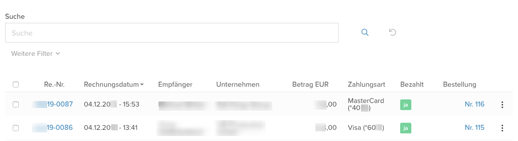 - Sie können die Rechnungen nach Zahlungsart und Bezahlstatus filtern, bzw. nur Stornos anzeigen lassen.