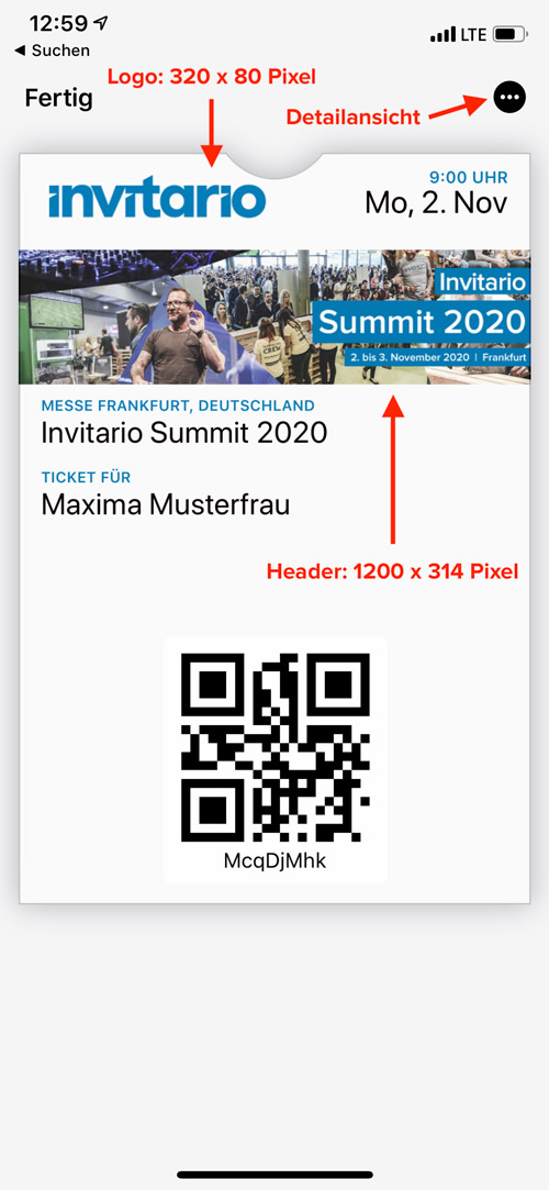 Da es sich hier um ein international standardisiertes Ticketformat handelt, sind für ein optimales Ergebnis folgende Einstellungen zu berücksichtigen. Neben dem Headerbild können Sie auch ein Logo verwenden.