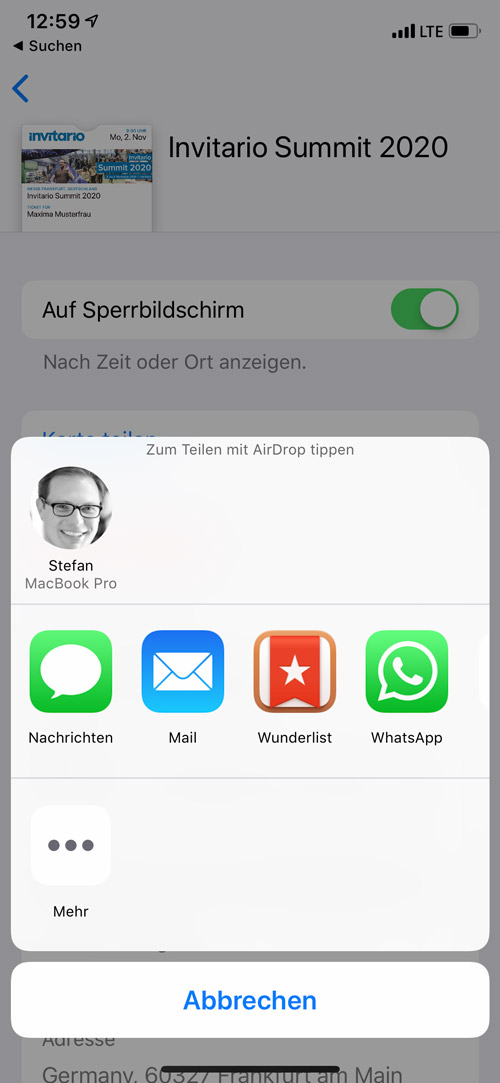 Teilen von Online-Tickets aus dem Wallet: Hat der Teilnehmer das Ticket in seinem Wallet gespeichert, kann das Ticket auch ganz einfach mit anderen Personen geteilt werden. Dies ist besonders dann von Vorteil, wenn Begleitungen angemeldet wurden: Über diese Funktion kann der Hauptgast seinen Begleitungen ein Online-Ticket aus dem Wallet zusenden.