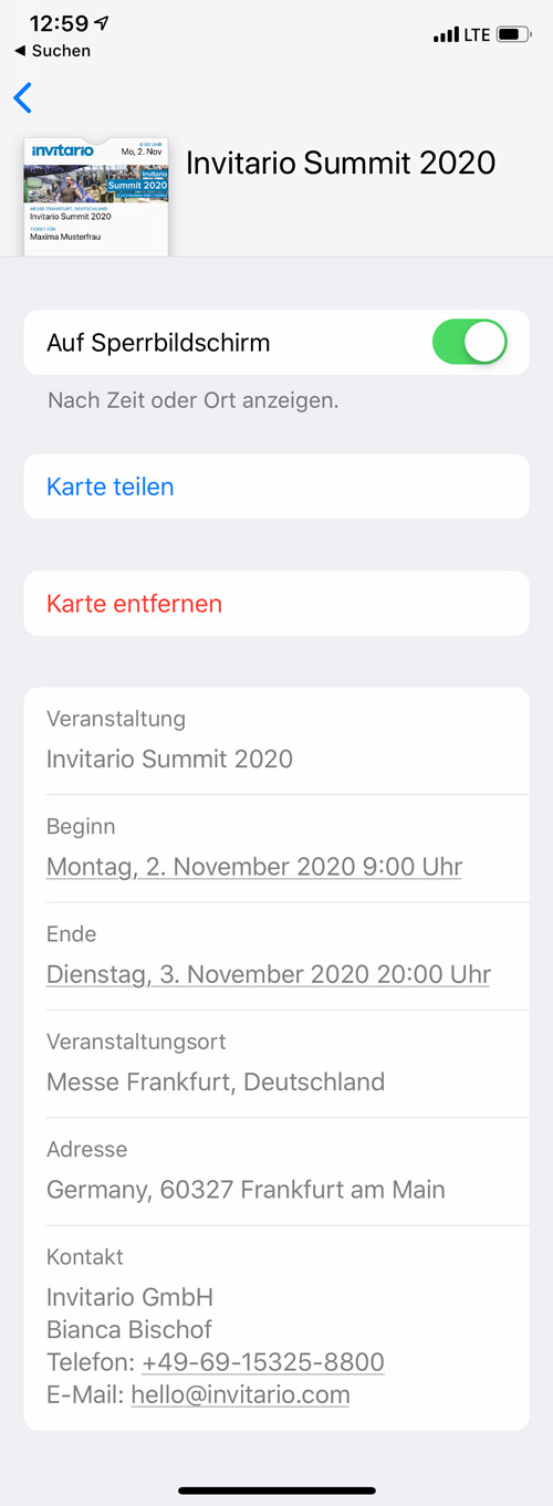 Hat der Teilnehmer sein Ticket im Wallet gespeichert, kann er über die Detailansicht noch folgende Informationen einsehen: