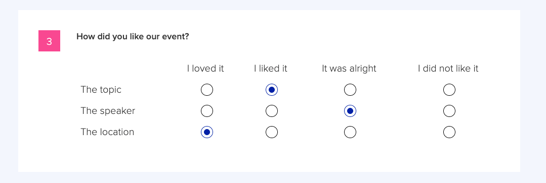 Die praktische Befragungsvariante ermöglicht es den Teilnehmenden, mehrere Fragen nach exakt dem gleichen Schema zu beantworten und vereinfacht gleichzeitig die Auswertung. Die Antworten können leichter quantifiziert und analysiert werden, was besonders für die Erfassung großer Datenmengen ideal ist.