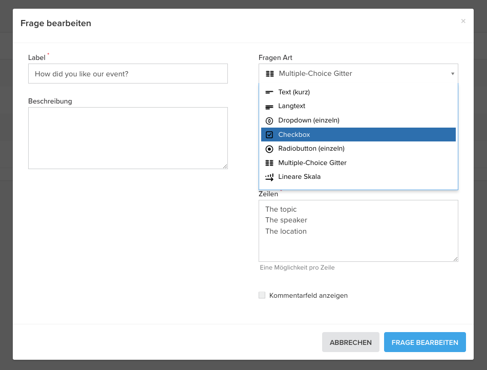 Um die verschiedenen Fragetypen schnell zu erkennen und auf sie zuzugreifen, gibt es jetzt entsprechende Icons im Menü der Fragetypen neben den verschiedenen Fragen.
