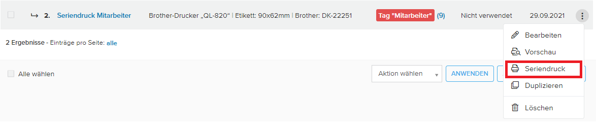 - Wählen Sie das so erstellte PDF aus ihrer Liste aus und wählen Sie im Schnellmenü der Konfiguration die Option > Seriendruck aus.