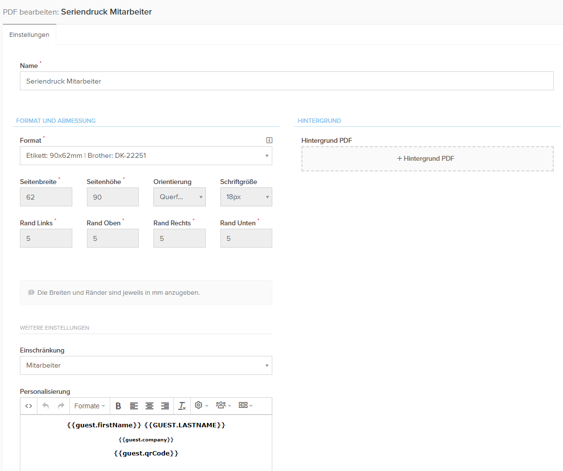 - Wählen Sie die Inhalte welche auf dem Namensschild erscheinen sollen im Feld "Personalisierung"