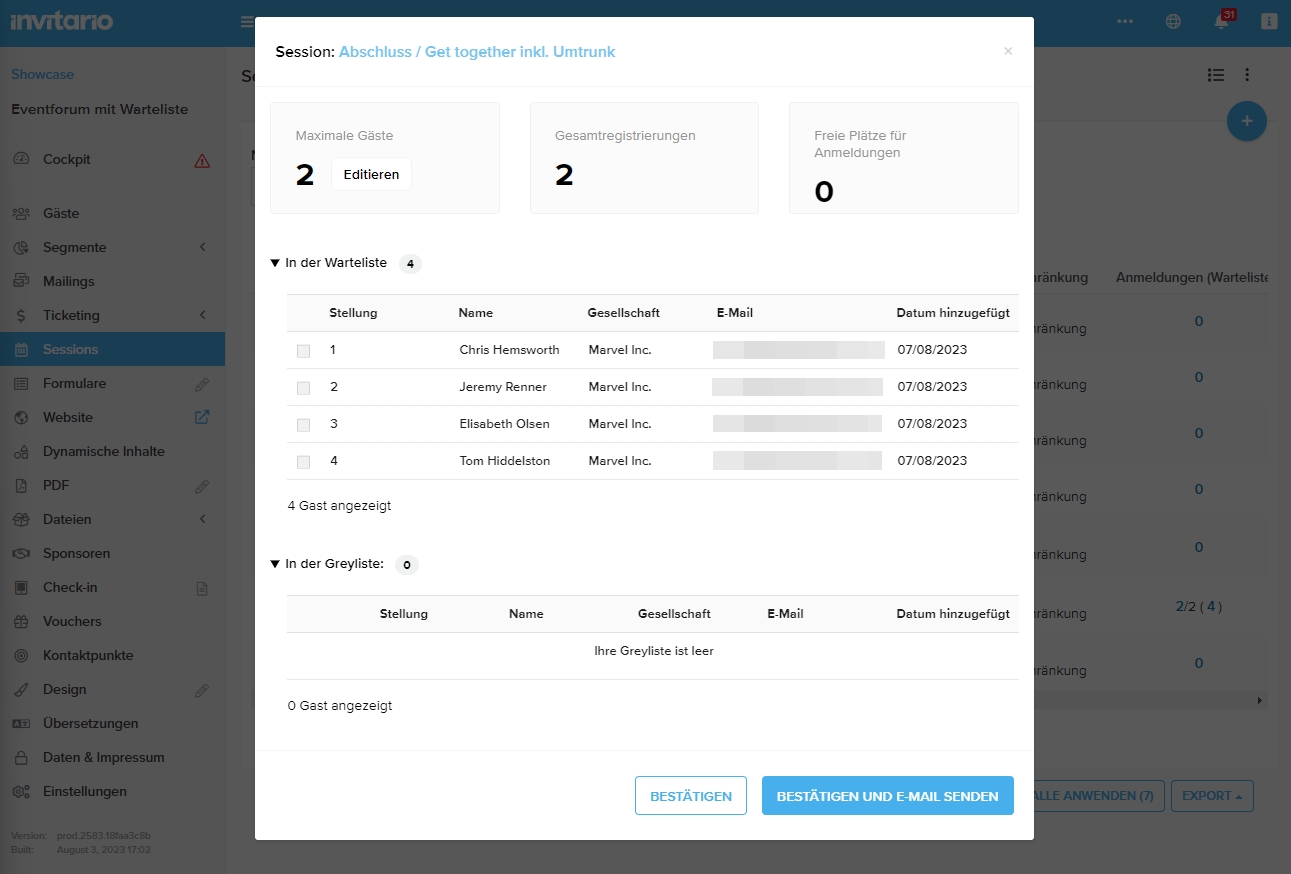 Mit der Greyliste erlauben Sie nur einer bestimmten Zielgruppe, sich für eine Veranstaltung oder Session anzumelden und können so die verfügbaren Plätze für Ihre bevorzugten Teilnehmer reservieren. Allen anderen wird die Anmeldung zur Warteliste ermöglicht, relevante Zielgruppen erhalten zuerst die Möglichkeit dazu.
