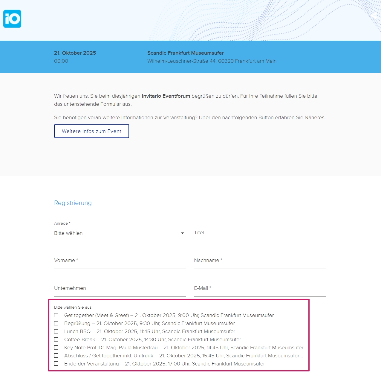 Dem Teilnehmer werden ab sofort verfügbare Sessions als Checkboxen angezeigt. Mit dem übersichtlichen Design war die Registrierung noch nie so einfach: Ansehen - Auswählen - Registrieren.