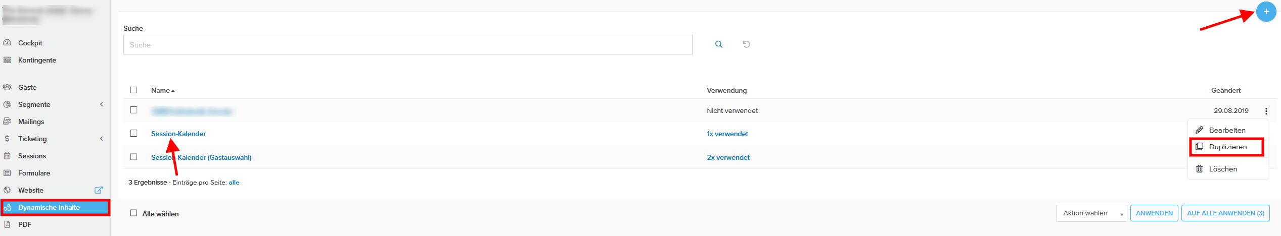 Anlegen eines Dynamischen Inhalts Öffnen Sie im Event > Dynamische Inhalte, um die Liste der "Dynamischen Inhalte" anzuzeigen. Wie oft ein “Dynamischer Inhalt” eingebunden ist, sehen Sie in der Liste in der Spalte “Verwendung”. Klicken Sie auf den ...