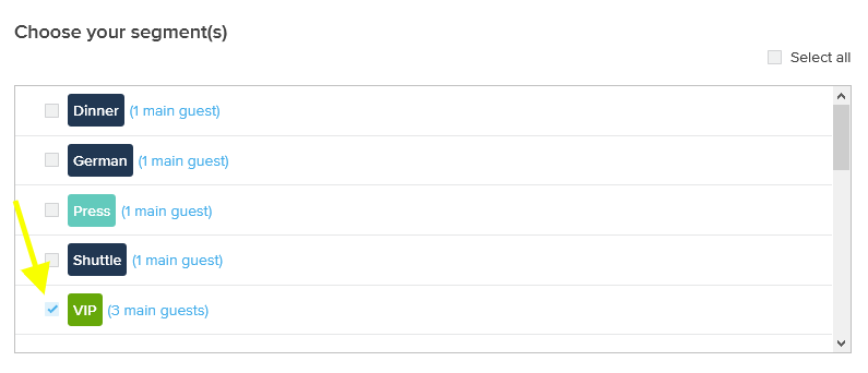 The “Select categories” box will show all of the default and custom target groups as well as custom tags that are associated with at least one main guest.