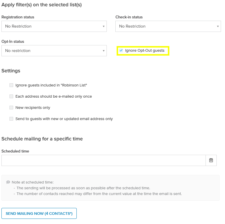 - Excluding recipients with an “opt-out” status from the mailing (Ignore opt-out guests). Please note that, if this setting is active, the relevant recipient will also be excluded from receiving a confirmation email with an admission ticket.