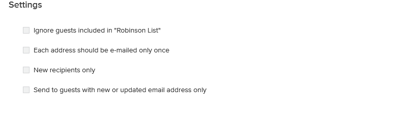 - Send to new recipients only: If a mailing has already been sent out once, this setting ensures that previous recipients will not receive a second copy of this mail. This setting can be used, for example, to only send out invitations in bulk to guests that have been retrospectively nominated.