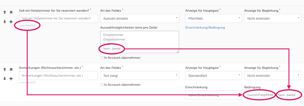 Dynamic Display of Form Fields You can dynamically display form fields, meaning they can be shown or hidden based on previous form fields or the guest's belonging to a target group or an assigned tag. To set this up, follow these steps: Click on ...