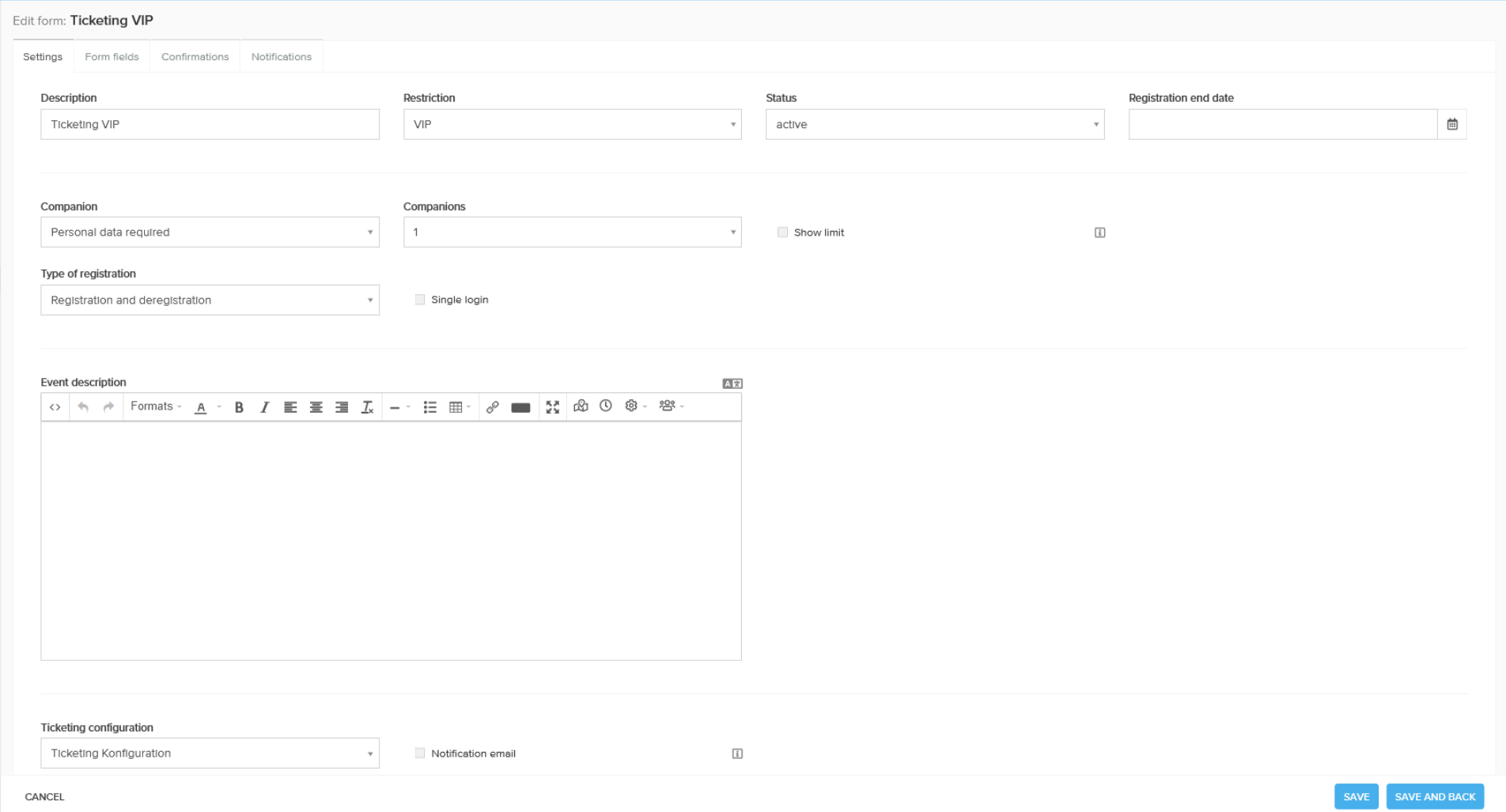 - “Confirmations” tab: For entering the texts to be displayed to a guest instead of the form after successfully registering or deregistering for an event on the website.