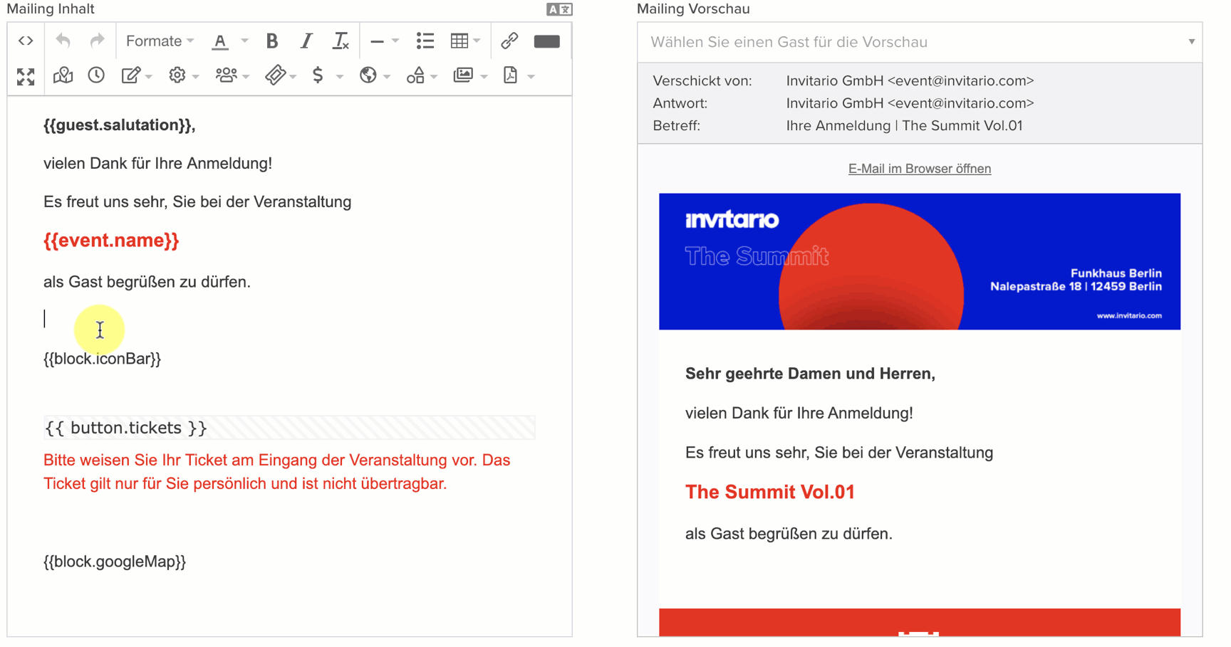 With macros, you can insert event basic data, guest data, personalized salutations, links to pages, forms, images and files, and personalized PDFs into "Dynamic Content". The macro commands are displayed in the bottom line of the text editor . The ...