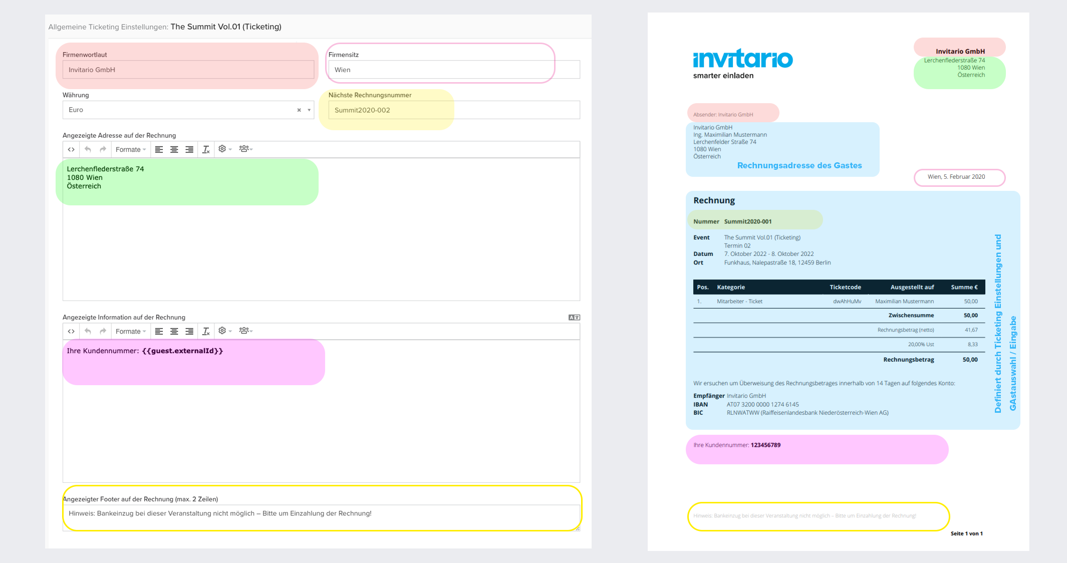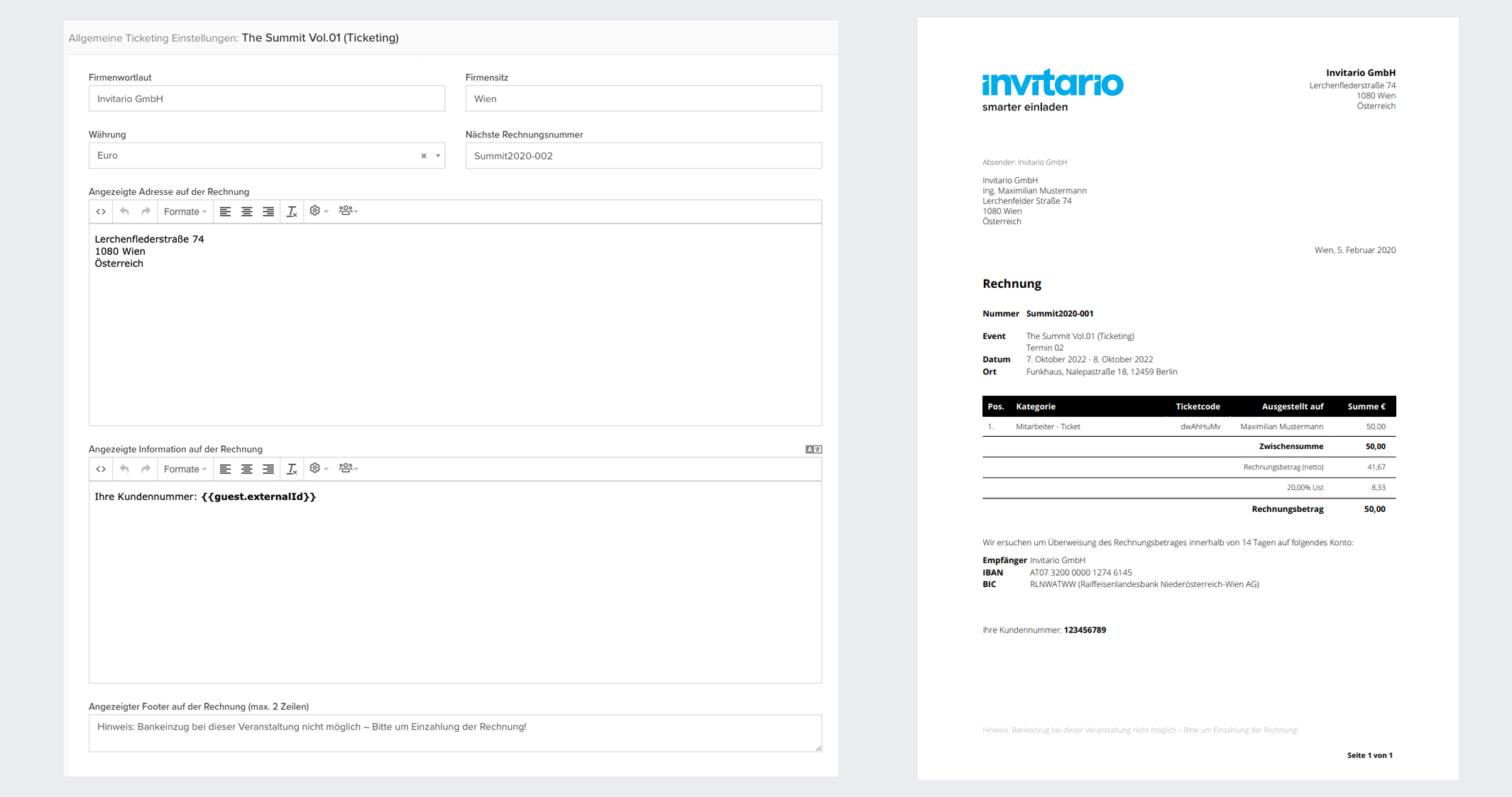 : After successfully completing a ticket order, an invoice is automatically created, which can be sent to the guest with the confirmation email. As the organizer, you are the sender of the invoice and you can customize it according to your requirements.