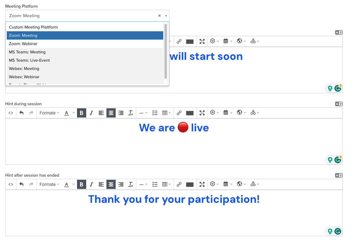 - Go to your event > create a session > tab 'Digital Session' > dropdown 'Meeting Platform' > select 'Zoom: Meeting' or 'Zoom: Webinar' > Save