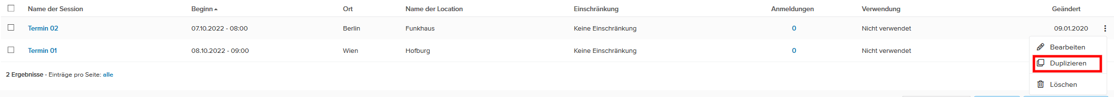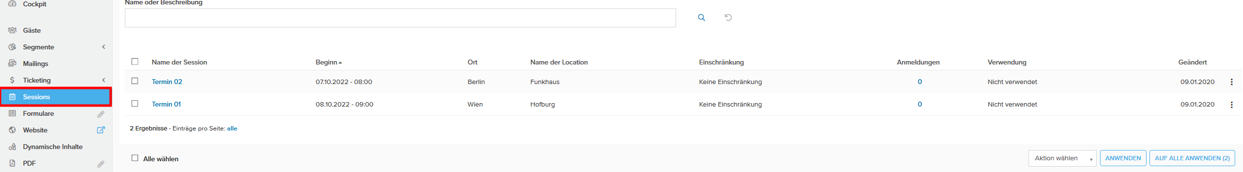 In the session list view, you have an overview of all created sessions, including the registration status. Therefore, the session list is useful both during the setup phase and the ongoing registration process.